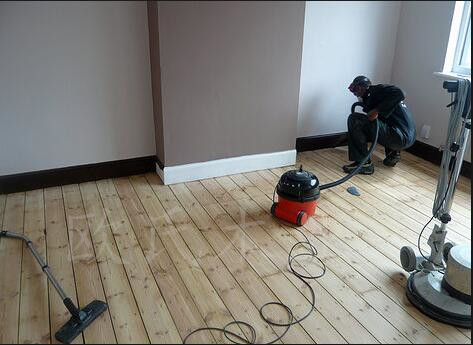 1、使用高精度地板打磨機按順方向用粗砂布打磨地板表面,使原舊地板表面打磨平整至使地板露出原來木質面;